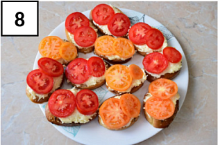 выложи по 2 кружочка помидора.